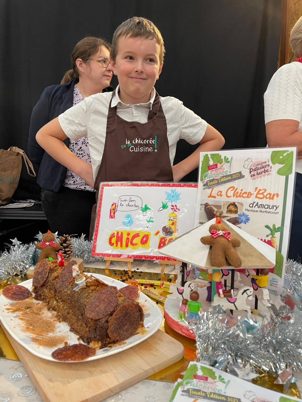 Amaury de Mannequebeurre, 9 ans, qui a présenté une bûche « La Chico'bar », à base de Carambar.