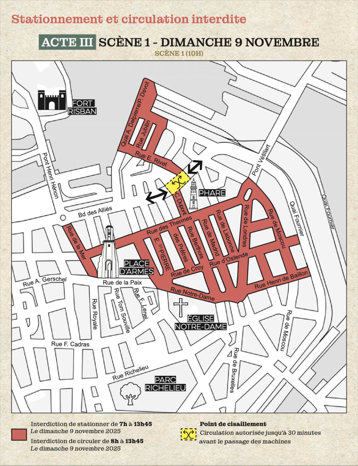 de 12h30 à 22h30 : boulevard des alliés, giratoire des anciens combattants, Quai d’Angoulême, place Henri Barbusse, Bassin-Ouest, rue Benoit, Place Chanoine Bourgeois, rue du commandant Charcot, rue Courtenveau, rue Jean-François et Maurice Delannoy, Quai Paul Devot, rue Jean-Noël Dubout, rue Gavet, rue du Havre, rue Jubilin, rue Léon Jacques Lesage, rue de la mer, place du Minck, rue Pierre Mulard, quai Jean-Jacques Pollet, rue Charles Ravisse, rue Reine, esplanade des sauveteurs en mer, rue des Thermes