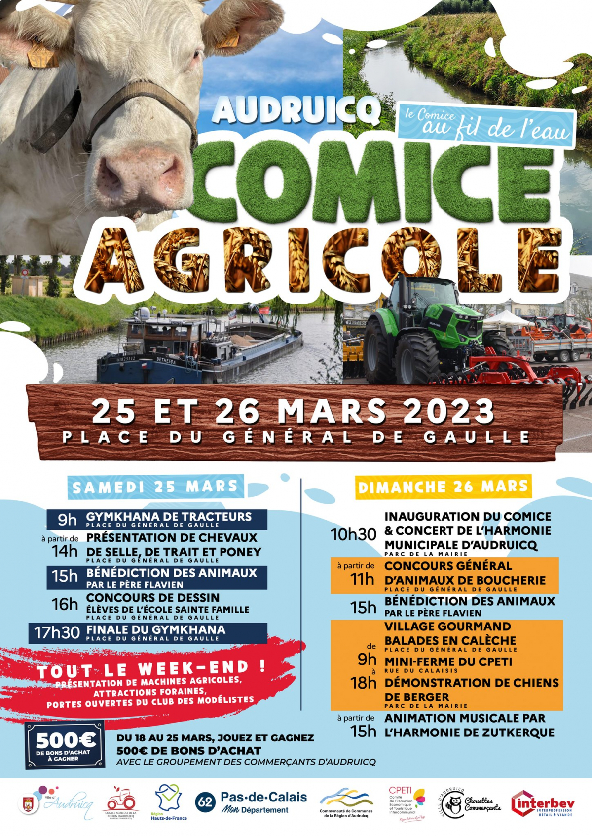Gymkhana de tracteurs, présentation de chevaux de selle, de trait et de poneys, concours d'animaux de boucheries, présentation de machines agricoles, village Gourmand, mini-Ferme du CPETI, démonstration - Chiens de berger, exposition de miniatures et Portes Ouvertes du Club des Modélistes d'Audruicq (à l'entrée du Parking des Anciens Ateliers Municipaux), balade en calèche gratuite autour de la Place, fête foraine, concerts des harmonies municipales d'Audruicq et de Zutkerque. Inauguration officielle le dimanche à 10h30.