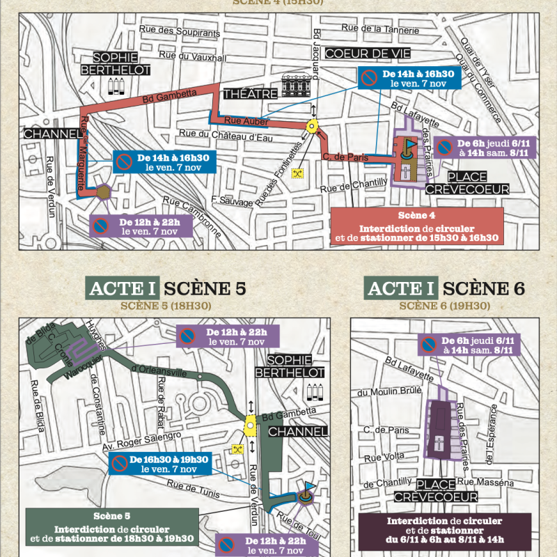de 15h30 à 16h30 : rue Réaumur, rue de la commune de Paris, rue de Valenciennes, place d’Alsace, rue Auber, rue du 29 juillet, boulevard Léon Gambetta, rue du général Marguerite, rue Marceau, place de Condé.