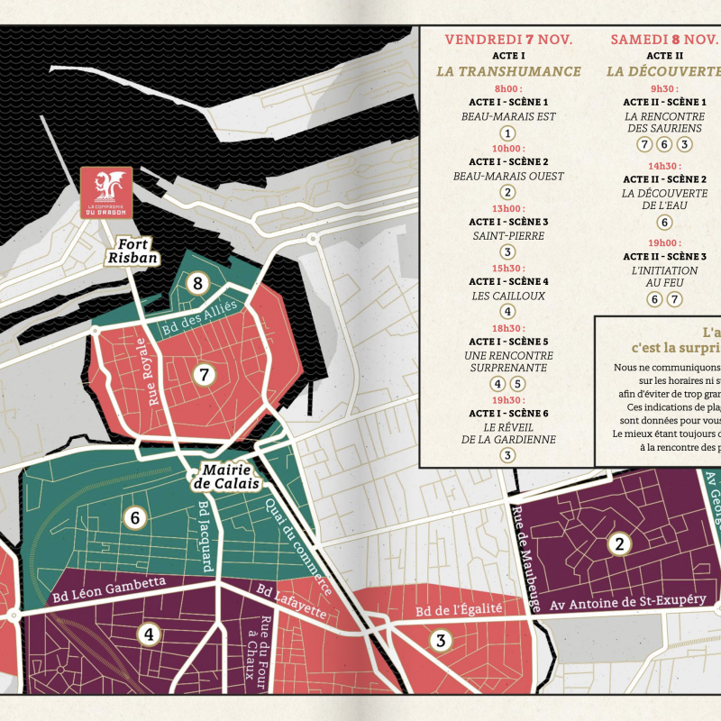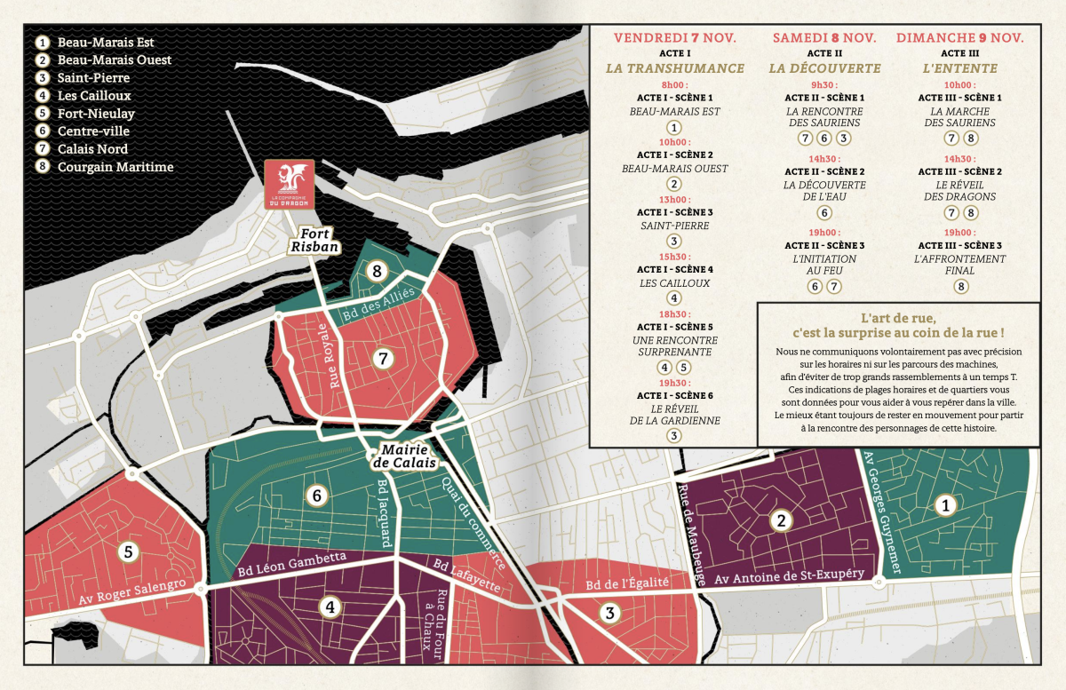 Si vous rejoignez le spectacle L’Odyssée cet après-midi, rendez-vous dans Calais Nord : le Varan de Voyage va y découvrir le pouvoir de l’eau, avec pour maître le Dragon de Calais.