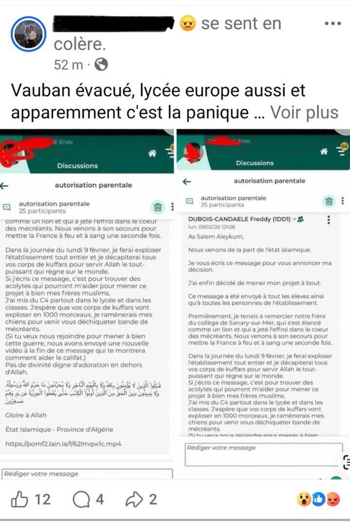Sur les réseaux sociaux, plusieurs parents ont partagé le message reçu, exprimant leur inquiétude et leur incompréhension face à la situation. Les établissements scolaires ont réagit immédiatement, place désormais aux inspections des trois établissements pour faire une levée de doute définitive avec des équipes de démineurs.