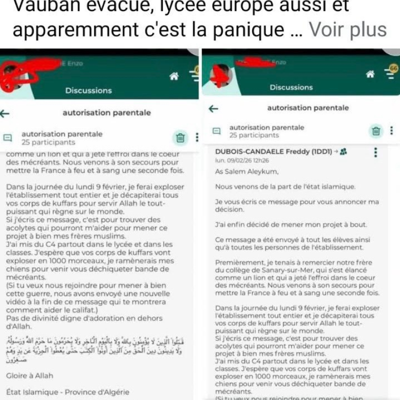 Selon nos informations, des élèves et leurs familles ont reçu un mail évoquant la volonté de faire "exploser l’établissement tout entier". Très rapidement, des captures d’écran du message ont circulé sur les réseaux sociaux, alimentant l’inquiétude de nombreux parents.