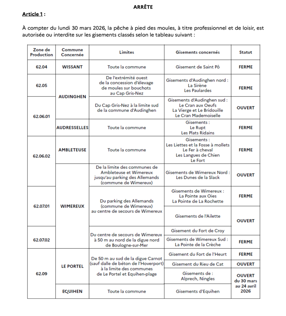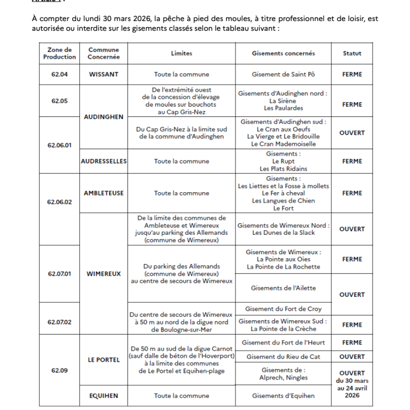 A partir de ce lundi 30 mars, jusqu'au vendredi 24 avril, tous les gisements d’Equihen-plage rouvrent tout comme ceux d’Alprech et Ningles au Portel. Ouverture aussi de certains gisements à Audinghen, Audresselles et Wimereux.