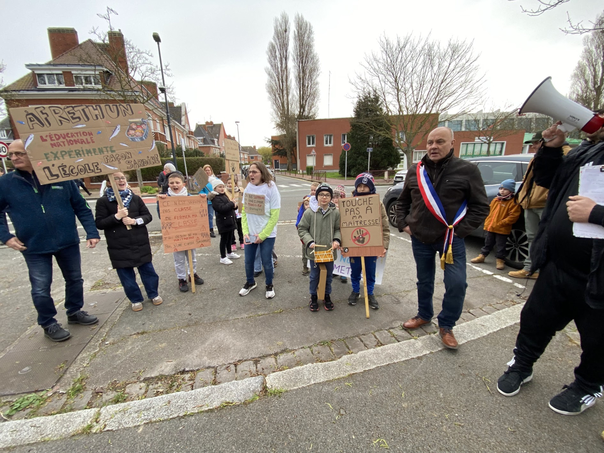 Le maire de Fréthun, Guy Heddebaux, était également présent contre le projet de fermeture d’une classe pour seulement cinq élèves en moins :