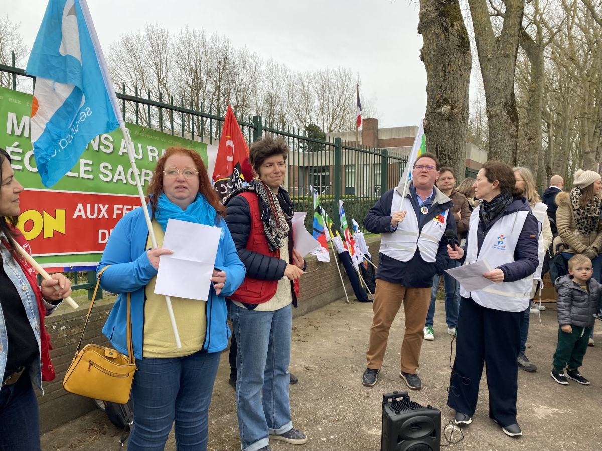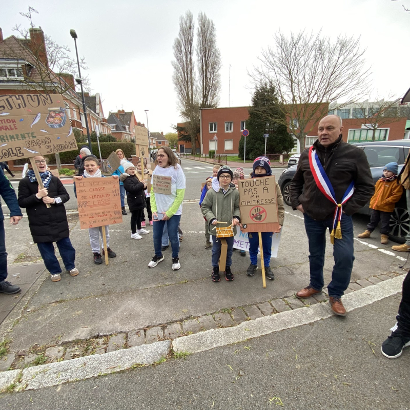 On trouvait ainsi une école de Coulogne. Magalie accompagnait des élèves de 10 ans, Lucine, Raphaëlle et Manon, pour s’opposer à la fermeture d’une classe :